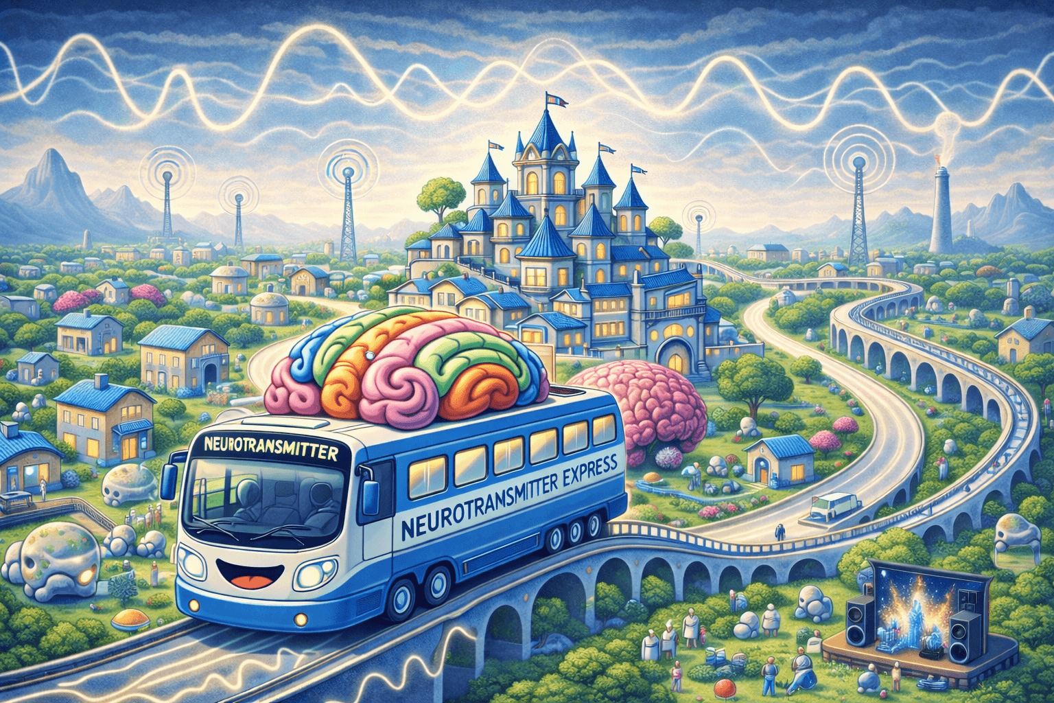Nu, laten we de "Neurotransmitter Express" nemen, een speciale bus die over deze wegen door Celleville reist. Deze bus vervoert neurotransmitters, kleine boodschappers die cruciale informatie bevatten. Deze neurotransmitters wachten op de trappen van het hoofdkwartier in CellVille, de Gedachtenfabriek, op een nieuwe boodschap die ze mogen verspreiden (naar de rest van ons lichaam). In de Gedachtenfabriek (ons brein) produceren neuronen constant nieuwe ideeën en gedachten. Neurotransmitters kunnen eiwitten zijn, of andere hormonen, zoals het gelukshormoon, het knuffelhormoon, het slaaphormoon, het stresshormoon, het waarschuwingshormoon, enz.